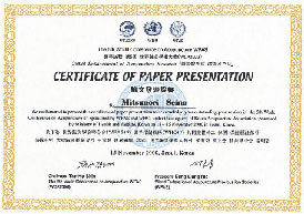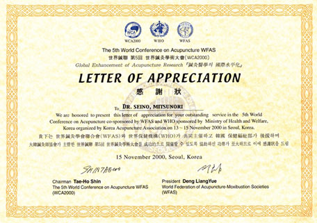 第五回 世界鍼灸学会で論文発表した際に学会から感謝状を頂きました。 下は論文発表証書です。