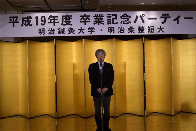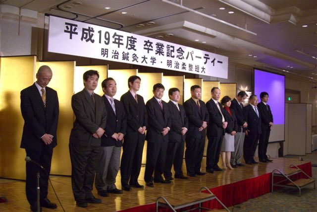 2008年(平成20年)3月14日(金)に、京都府京都市・京都ホテルオークラで第22回明治鍼灸大学鍼灸学部同窓会「たには会」入会式・第4回柔道整復学部同窓会「やわらぎ会」入会式および卒業記念パーティーが開催されました。鍼灸学部鍼灸学科99名、保健医療学部柔道整復科31名(第1回卒業生)、医療技術短期大学部柔道整復科11名(第4回卒業生)が晴れて同窓会正会員になりました。保健医療学部柔道整復科の卒業生は今年が初めてです。日本で初めての「柔道整復学士」が誕生しました。当院院長は、たには会副会長として出席しました。 |