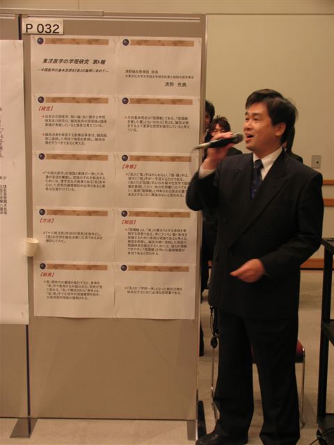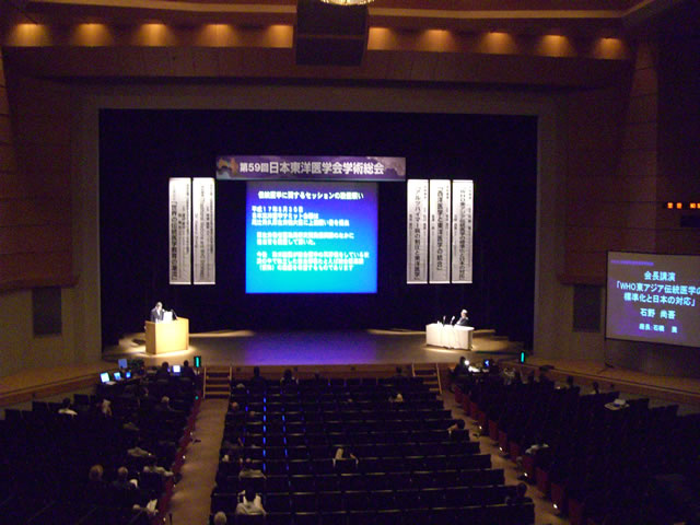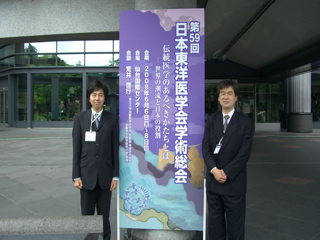 2008年(平成20年)6月6日(金)〜8日(日)に、宮城県仙台市の仙台国際センターにおいて、 第59回日本東洋医学会学術総会が開催されました。医師・鍼灸師が中心になり鍼灸治療と漢方薬を主に研究する学会です。医師国家試験に漢方薬の問題が出題されることになり、国内80の医学部では「漢学」の教育と研究が盛んになっています。「漢学」の中枢を担う鍼灸医療の教育は4つの医学部にとどまっていますが、附属病院では25の大学で鍼灸治療を行っています。「中国の医療」は日本に渡り、日本で独自の発展を遂げました。日本で行われている鍼灸治療や漢方薬治療は日本固有のものです。この分野では日本が世界最先端です。我が国の医療が本来あるべき姿に近づいてきました。世界のモデル国となる日が近づいて来ています。7日(土)に、当院を代表して中村幸雄先生が論文発表しました。 |