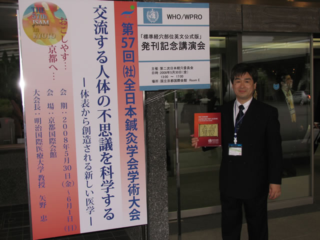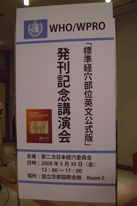 2008年(平成20年)5月30日(金)に、京都府京都市の国立京都国際会館において、「WHO/WPRO標準経穴部位公式版 発刊記念講演会」が開催されました。2004年から日本・中国・韓国がWHOと各国の協力を得て、3国で異なっていた「経穴」の位置を標準化する作業を行っていましたが、2007年に合意しました。今回の記念講演会は、2008年5月16日に英語版が出版されたことを受けてのことです。世界に先駆け、日本で最初に行われたことで、NHKが取材に訪れました。この模様は、6月2日(月)に放送されております。 |