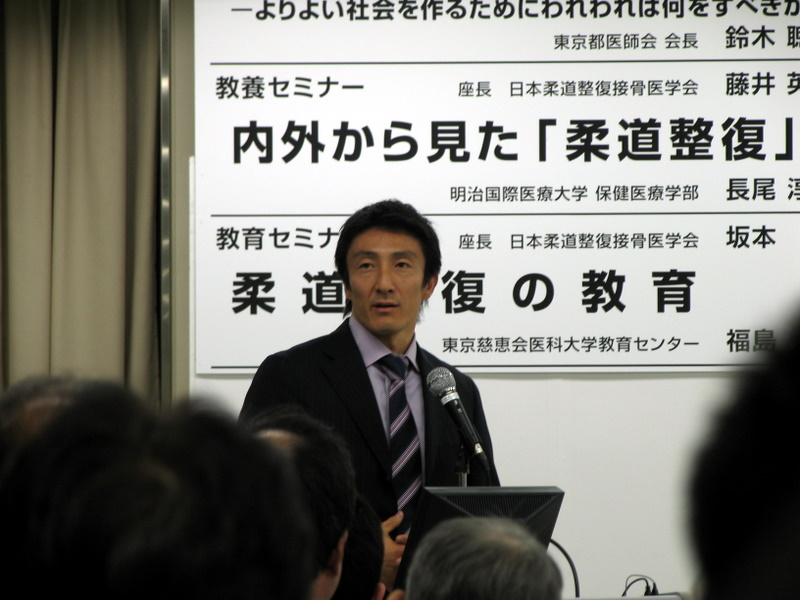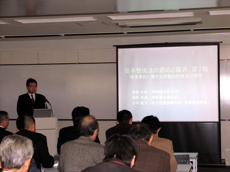 2008年(平成20年)11月23日(日)・24日(月)に、東京都渋谷区のTKP代々木ビジネスンセンターにおいて、第17回日本柔道整復接骨医学会学術総会が開催されました。非観血手術を行う柔道整復師の治療技術を現代医学の手法で解明する学会です。当院は「徒手整復法の適応と限界」を7年連続で発表いたしました。今年の演題は「鎖骨骨折に関する非観血的療法の限界」です。過去6年と異なり、徒手整復術での治療が困難であった例を紹介しました。「柔道整復学」の中で最も重要な徒手整復術の最先端技術を有する当院の発表は注目を集めました。 当院を代表し、金親孝明副院長が発表いたしました。 |