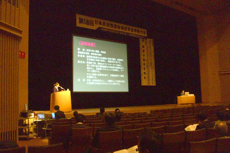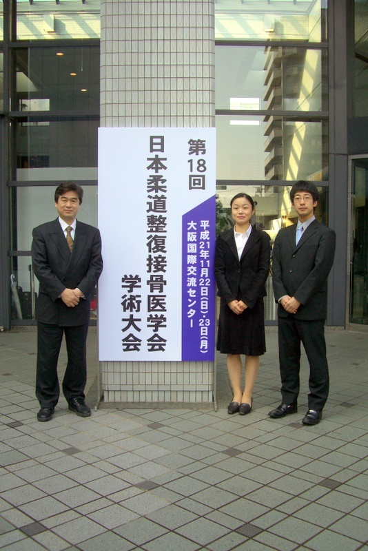 2009年(平成21年)11月22日(日)・23日(月)に、大阪市・大阪国際交流センターにて「第18回日本柔道整復接骨医学会」が開催されました。23日に、当院を代表し、村田朝子分院長が「徒手整復の適応と限界第8報 趾骨骨折に対する固定法の重要性」と題して論文発表しました。柔道整復師固有の治療法である外科手術・徒手整復術に関する演題が年々減少し、昨年は当院のみでしたが、今年は一転して10題以上ありました。当院の8年に及ぶ研究発表が、業界の研究姿勢に一石を投じたのではないかと感じた学会でした。 |