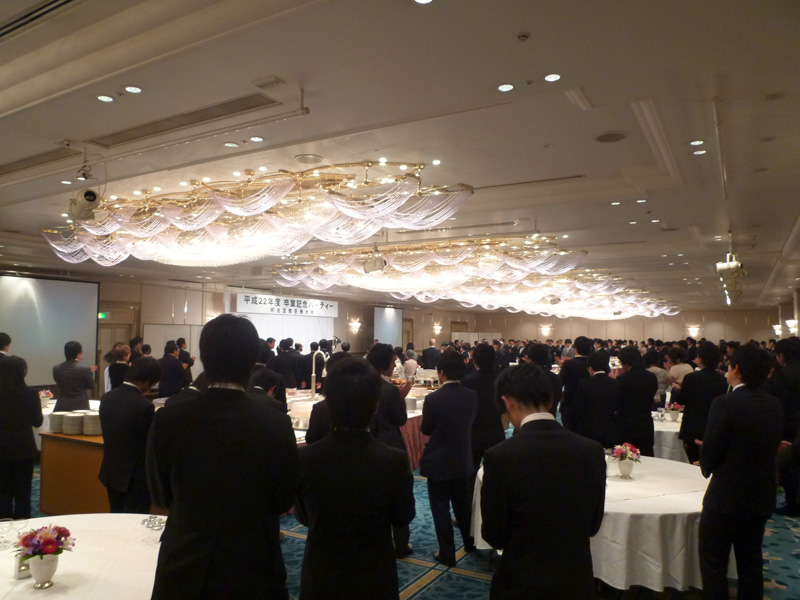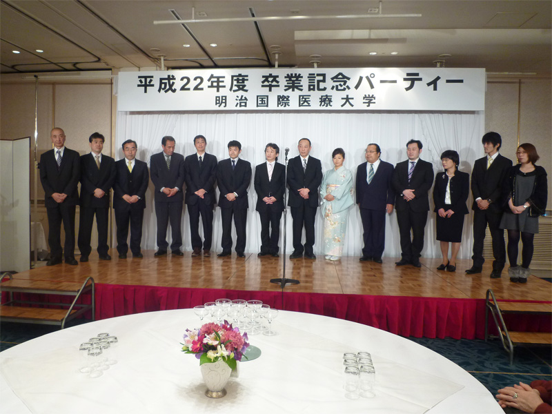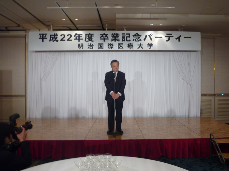 2011年(平成23年)3月15日(火)に、京都府京都市にある京都ホテルオークラにおいて、第25回明治国際医療大学鍼灸学部同窓会「たには会」入会式・第7回柔道整復学部同窓会「やわらぎ会」入会式・第2回看護学部同窓会「なごみ会」入会式および卒業記念パーティーが開催されました。鍼灸学部鍼灸学科76 名、保健医療学部柔道整復科44名、看護学部看護学科31名が同窓会正会員になりました。次代を担う医療人たちが、喜びを発散していました。開会冒頭で、中川雅夫学長より、明治東洋医学院理事長として初めてご挨拶を戴きました。当院院長は、鍼灸学部同窓会たには会副会長として出席しました。 |
