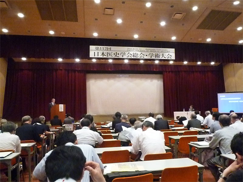 2011年(平成23年)6月11日(土)12日(日)に、第112回日本医史学会が、東京都文京区本郷にある順天堂大学において開催されました。今学会は、4年に1度開催される日本医学会の第1分科です。毎年総会が開催されていますが、今年で112回目となる日本の医学界において一番歴史ある学会です。日本医史学会の会長である酒井シヅ医学博士は、順天堂大学の名誉教授・特任教授です。80ある医学部の中で、医史学研究室があるのは順天堂大学だけです。今大会は、日本の医学教育史について話し合われました。今の医学教育に関する問題点が浮き彫りになりました。今後の医学教育に役立てることができる、とても意義深い学会となりました。 |