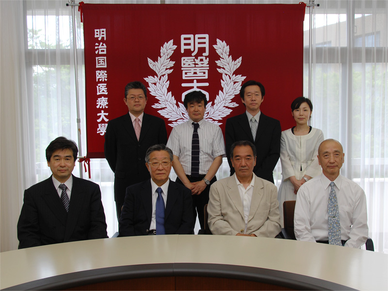 明治国際医療大学は、鍼灸学部、保健医療学部、看護学部の3学部になりました。それに伴い、平成23年4月1日より「大学同窓会」が新たに創設され、初代会長に中川雅夫学長が就任しました。また、副会長には、鍼灸学部同窓会たには会会長、保健医療学部同窓会やわらぎ会会長、看護学部同窓会なごみ会会長が就任するという規程が設けられました。運営は、3同窓会がそれぞれ行うことになったため、たには会事務局は大学内より移転することになりました。このことは、同窓会設立31年目において画期的な出来事です。2011年(平成23年)6月28日(火)に、明治国際医療大学内において、前会長中川雅夫学長より新会長近藤好伸短大1期生に、会長印等を引き継ぐ作業を行いました。当院院長は、副会長として出席しました。 |