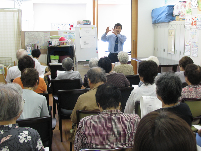 2011年(平成23年)9月8日(木)に、東洋医学専門保健機関である健康研究サークルオアシス主催の「第24回オアシスの集い」を実施しました。演題は「変わりゆく日本の社会保障」 ーこれからの医療・福祉をひもとくーです。オアシス会員に対し、通所介護施設である「ちあふる清野」の見学会を兼ねて行いました。保健・医療・福祉の問題点を、会員の皆様と話し合いました。講演後に、オアシス会員の体力を測定しました。 |