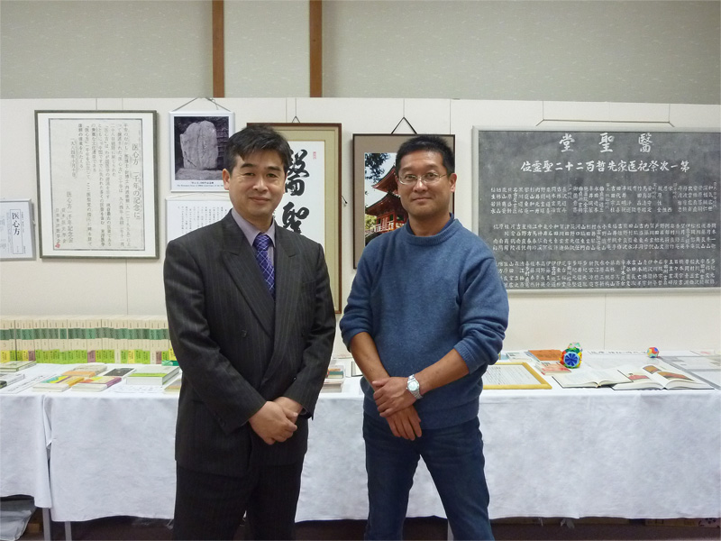 2011年(平成23年)11月1日(火)〜3日(木)に、京都府京都市にある護王神社内の護王会館にて、第19回医療文化史サロンが開催されました。江戸時代の鍼灸に関する書物や平安時代に丹波康頼が編纂した日本最古の医学書『医心方』に関連した書物の展示が行われました。主催者は、日本最初の医者である和気清麻呂の子孫です。歴代の医家が連なる名前を見て、真摯な気持ちになりました。共催は、日本医史学会です。明治国際医療大学准教授今井賢治鍼灸学博士とともに、鍼灸医学文献に対する説明役をしました。 |
