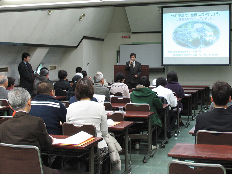 2011年(平成23年)12月11日(日)に、東京都中央区にある中小企業会館において、第3回関東地区明治国際医療大学鍼灸学部公開講座および第49回鍼灸学部同窓会たには会関東支部研修会が開催されました。今回のテーマは、「お腹の調子は健康のみなもとーはり・きゅうで胃腸も元気ー」です。関東地域全域より、鍼灸医療に興味をお持ちの市民に、多数お集まりいただきました。講演の後、自宅でできるツボ療法を、関東支部役員が紹介させていただきました。当院院長は、関東支部名誉支部長として、皆様にご挨拶をさせて戴きました。 |