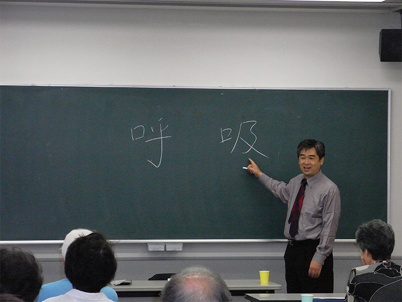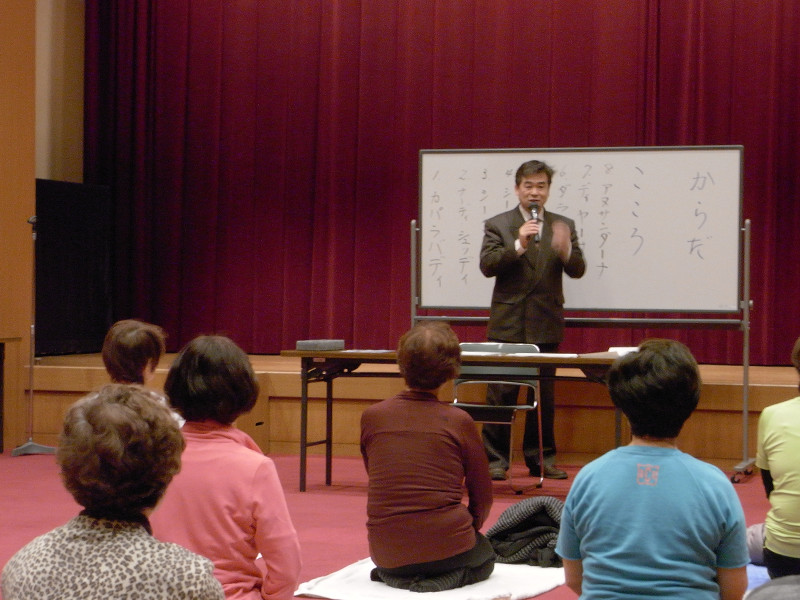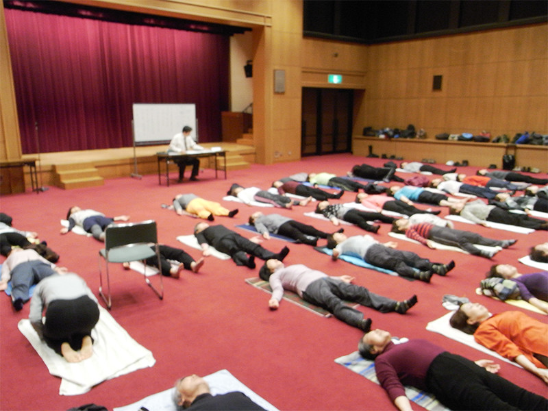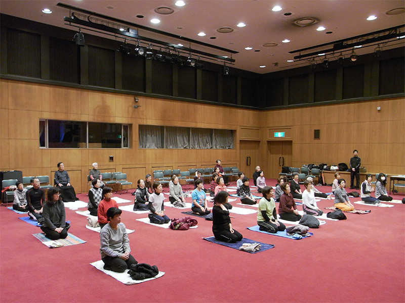 2013年(平成25年)11月19日(木)に、調布市文化会館「たづくり」において、第32回健康体操教室合同練習を開催しました。今回は、近年では最も多い37名の方にご参加いただいたことから、皆さんの健康に対する関心の高さをうかがい知ることができました。 今回は、従来のヨーガアーサナ練習に代わって、呼吸法と瞑想法を行いました。数ある呼吸法の中から、いくつか代表的なものを取り上げ、解説を交えながら実践しました。少し難しいと思われる内容でしたが、ヨーガの神髄に触れるひとときを楽しんで頂けたと思います。 |