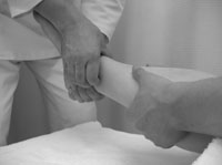 患者に自発痛は無かったが、前日の固定後、時間経過とともに痺れが再度出現。レントゲン写真と患者症状より再度転位が発生したと判断し、再整復を行った。脛骨の末梢骨片が容易に転位してしまうことを考慮し、中枢骨片を末梢骨片に接合させることとした。患者を仰臥位にし、術者は右手の四指にて脛骨末梢骨片を後方から把持し、固定した。両母指で中枢骨片を後外方へ押圧し末梢骨片に接合させた