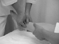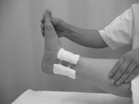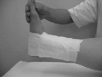整復後の転位を防ぐため、外果部に綿花枕子をあてる。 |