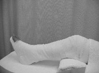 患部の固定、腫脹軽減を目的に脛骨内果部の後方、側方より圧迫枕子を加えた。腓骨は転位がないため前後方向からの圧迫枕子のみとした。両骨とも患部の動揺を防ぐため、テープによる固定を行った。冷湿布を行い、大腿中央より足先にかけて背側にクラーメルシーネをあて、包帯にて固定を行った。固定肢位は膝関節軽度屈曲位、足関節良肢位とした(図3)。右患側肢への体重付加を禁止。松葉杖歩行を指示した。