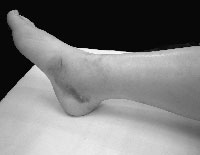 右下腿内足方向よりの写真。内果下方に内出血を認める。 |