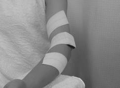 伸縮テーピングをらせん状に巻いて 維持するため固定肢位は肘関節90°
