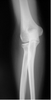 図1 a 初診時レントゲン正面像 図1 b 初診時レントゲン斜位像