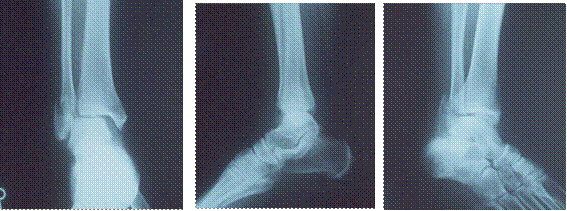 X線所見:正面像において、腓骨遠位端部の骨折及び、遠位骨片の外側への転位が認められた。側面・斜位像において、末梢骨片の後上方への転位が認められた。加えて距骨の外方への変位が認められた(図1)。