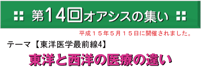 2003年(平成15年)5月15日に第15回オアシスの集いを実施。東洋医学の最前線4「東洋と西洋の医療の違い」を分かりやすく講演。一般市民も多数参加し、質問が相次ぎ大幅に時間を超過するなど、東洋医学への関心の高さを実感。(講師 清野鍼灸整骨院院長 清野 充典)