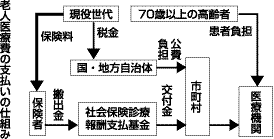 社会保険診療報酬支払基金は厚生省が年度当初に概算で決めた額の拠出金(老人保健拠出金)を健保組合などの保険者から集め、70歳以上の老人医療費の7割(患者負担分を除く)にあたる交付金として市町村に出す。市町村は3割分の公費(国3分の2、地方自治体3分の1)を加え、医療機関に払う。支払基金は概算の拠出金で足りない場合、銀行から借り入れ、2年後に精算額として、その年の拠出金に上乗せして保険者に請求する。