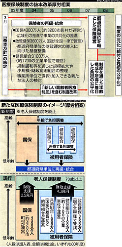 老人保健制度07年度めど廃止 高齢化で増え続ける医療費負担について坂口力厚生労働相は25日、制度の抜本改革案を公表した。07年度をめどに老人保健制度を廃止し、年齢や所得に応じて、医療保険団体が相互に、負担調整するルールを導入。国が運営する政府管掌健康保険と市町村の国民健康保険は都道府県単位で再編し、健康保険組合は統合を進める。診療報酬体系は2年後をめどに、医療技術と医療機関の運営コストの二つの尺度から見直すよう提案した。厚労省はこの案に沿って改革を進める手順を詰め、11月にも省案を示す方針。年末をめどに与党などと調整し最終案をとりまとめる。