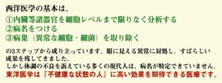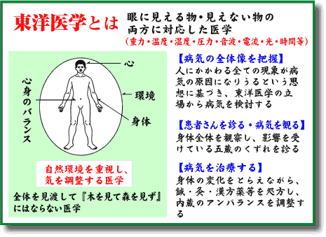 日本では医療法で西洋医学の医療機関内で東洋医学特に鍼灸医療を受ける事が法律で認められていません。 このコーナーでは1つ1つの鍼灸の適応症を例にとりながら、統合医療の理解度を深めていただき、鍼灸医療を上手に受診していただきたいと思っています。