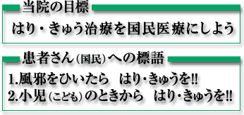 | 当院は、これからの高齢化社会を支える20〜50歳代の社会人の健康管理及び病気回復をモットーにした治療院として1987年(昭和62年)2月2日に開設いたしました。 |